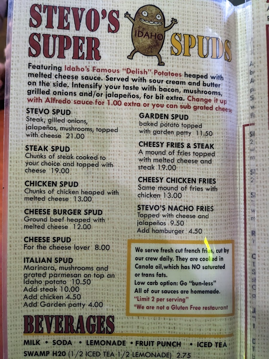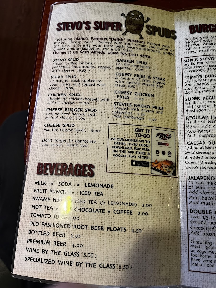 But Stevo's isn't just about seafood; their signature Spuds, including the Cheesy Chicken Fries and the hearty Stevo Spud, promise satisfaction for every craving. Don’t forget to leave room for dessert! The New York Cheesecake and Choco Flan are sweet endings at $5.50.