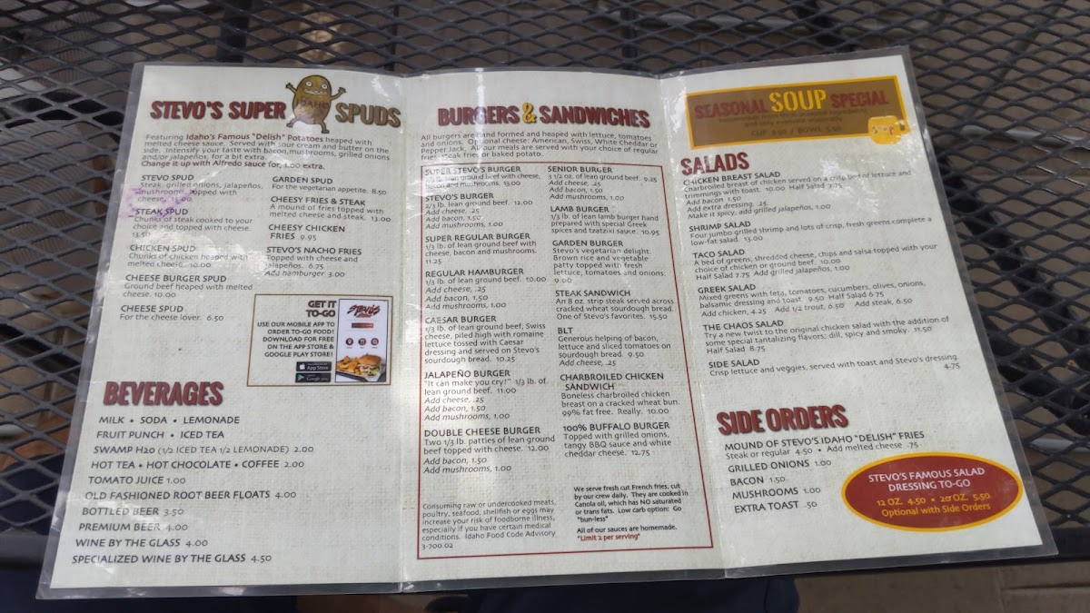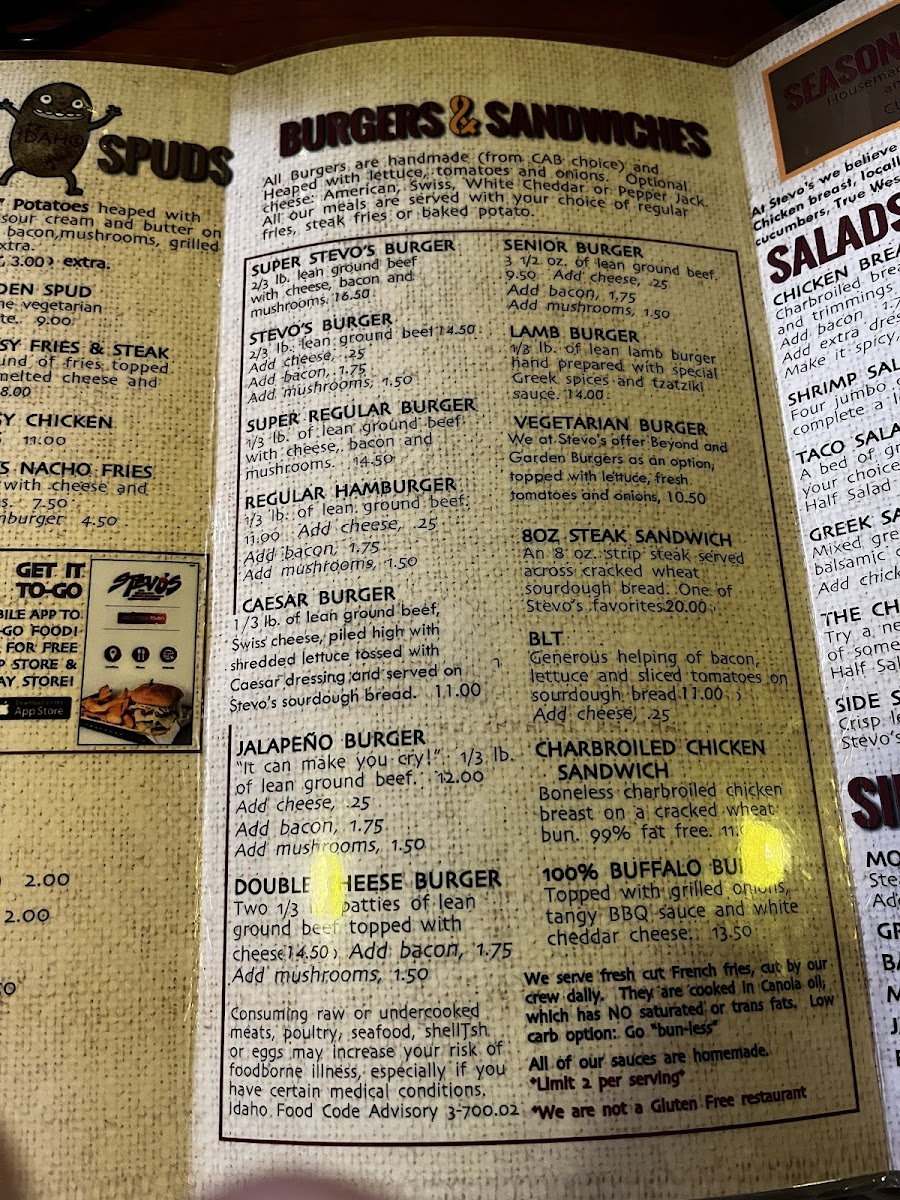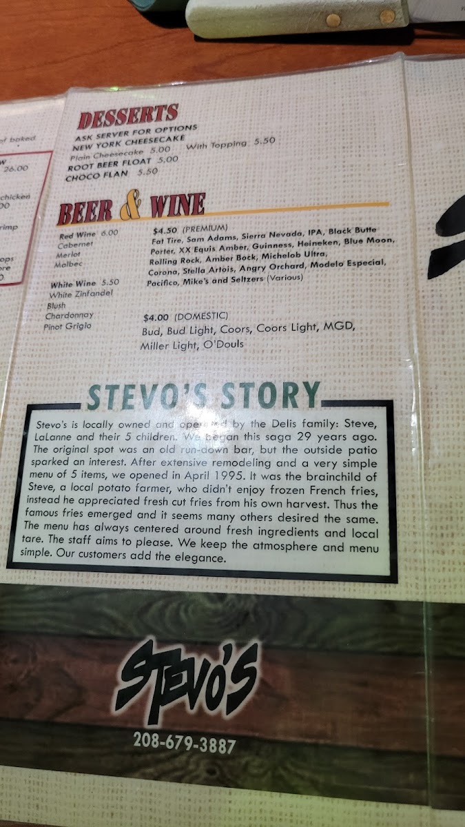 Welcome to Stevo's, a culinary gem nestled in Heyburn, ID. This delightful eatery offers a diverse menu that elevates classic favorites with a twist. Seafood lovers will rejoice in the variety of dishes, such as the Fish & Chips or the savory Trout Sandwich available at just $11.00. For something indulgent, try the Basket of Shrimp or the delicious Salmon Burger.
